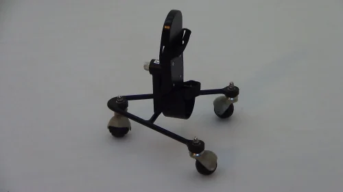 Powder coated, steel rod fabricated skate, fitted with three free movement casters & an aluminum foot hold with straps for hip exercises. Can be used on the exercise board.