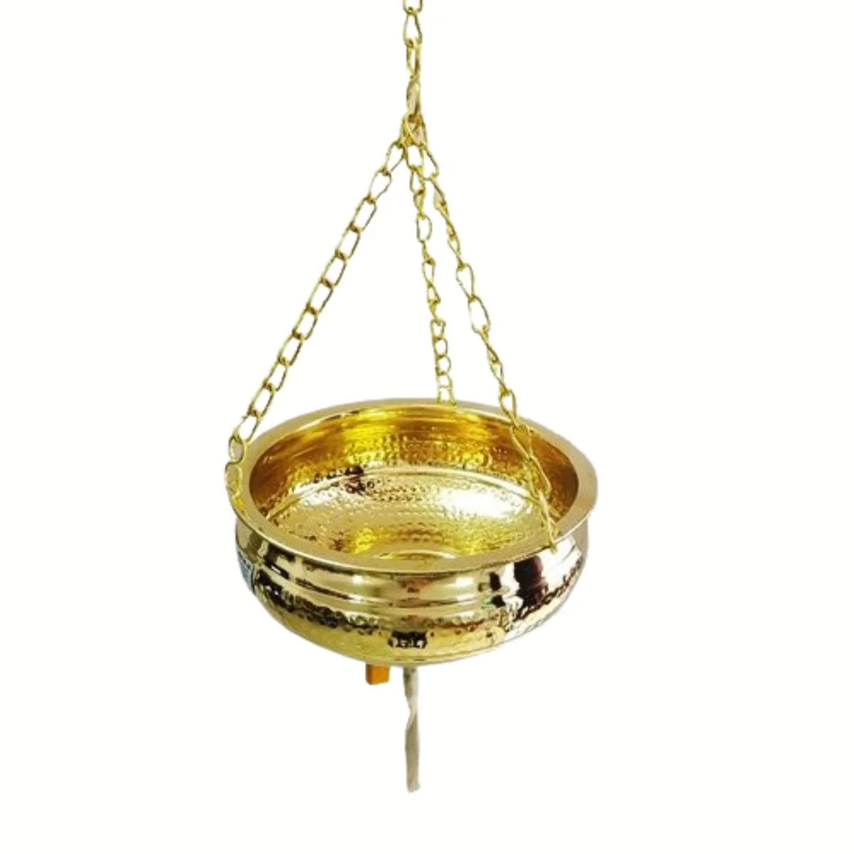 Panchakarma acco SHIRODHARA POT/YANTRA (Brass) A shallow Brass pot with beautiful brass chains and 'S' hook to hang to a hook/stand for shirodhara oil treatments. Pot with Oil capacity of 2lit. is fitted with oil flow control valve mechanism. Pot with hammer marks has a bright natural finish.